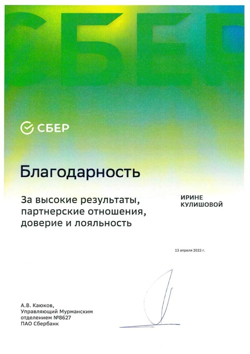 - ПАО «Сбербанк», благодарность за высокие результаты, 2022 г.
