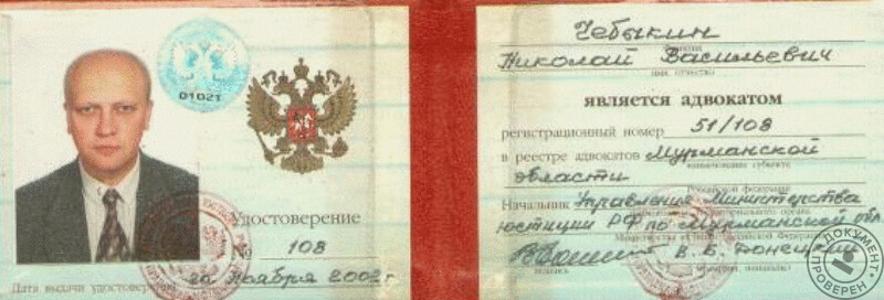 - Управление Министерства юстиции РФ по Мурманской области, удостоверение адвоката (2002 г.).