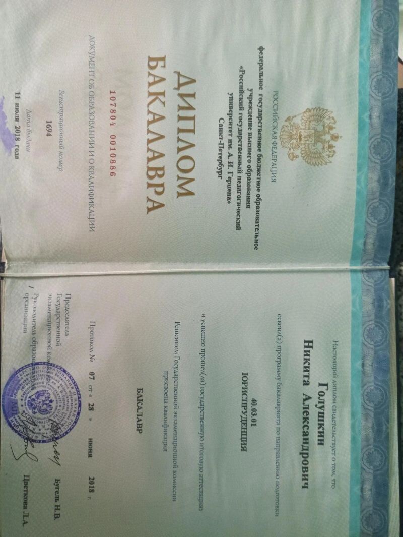 - Российский государственный педагогический университет имени А.И. Герцена, юриспруденция, бакалавр, 2014–2018 гг.