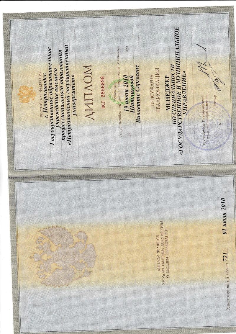 - ГОУ ВПО «Петрозаводский государственный университет», государственное и муниципальное управление, 2010 г.