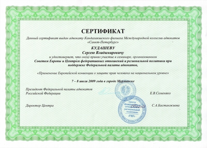 - Адвокат реестра Мурманской области (с 2002 г.).
