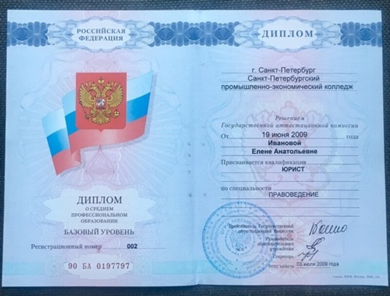 - Санкт-Петербургский промышленно-экономический колледж, правоведение, 2009 г.