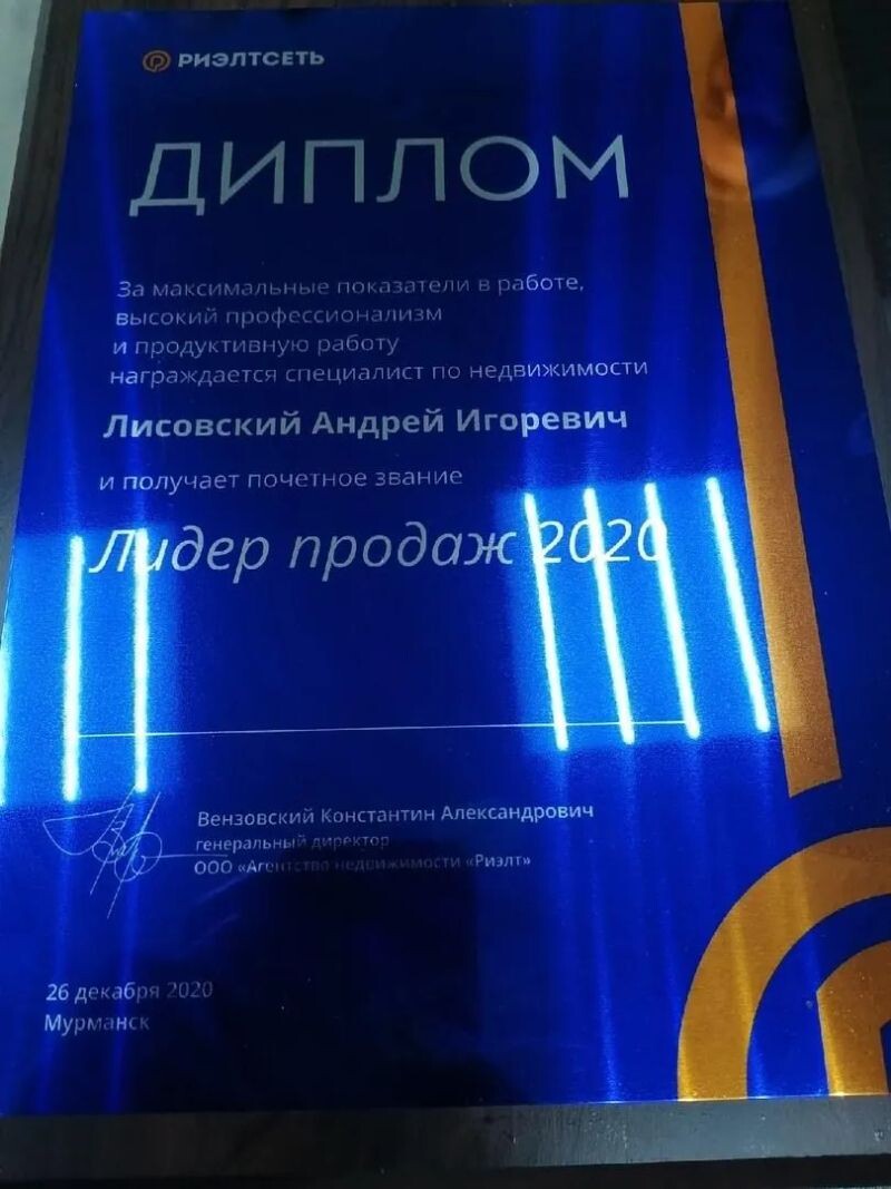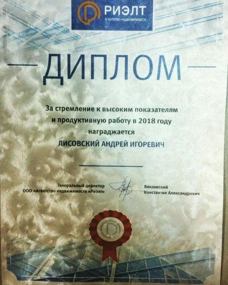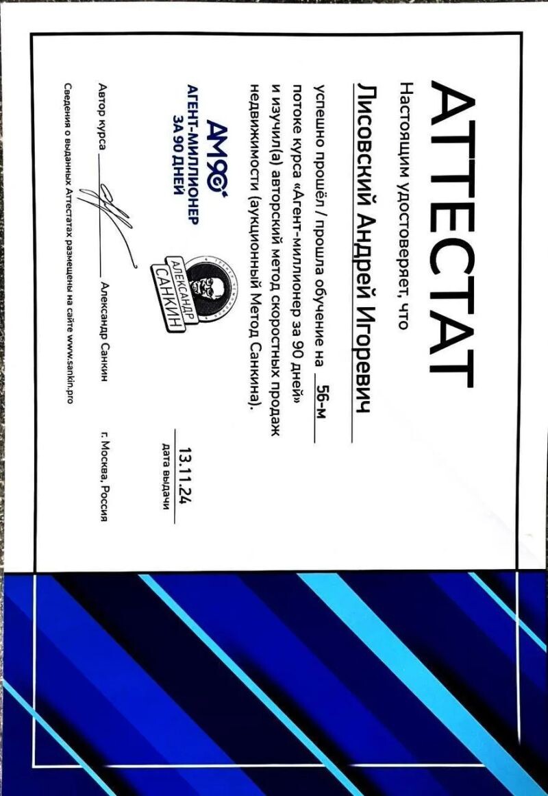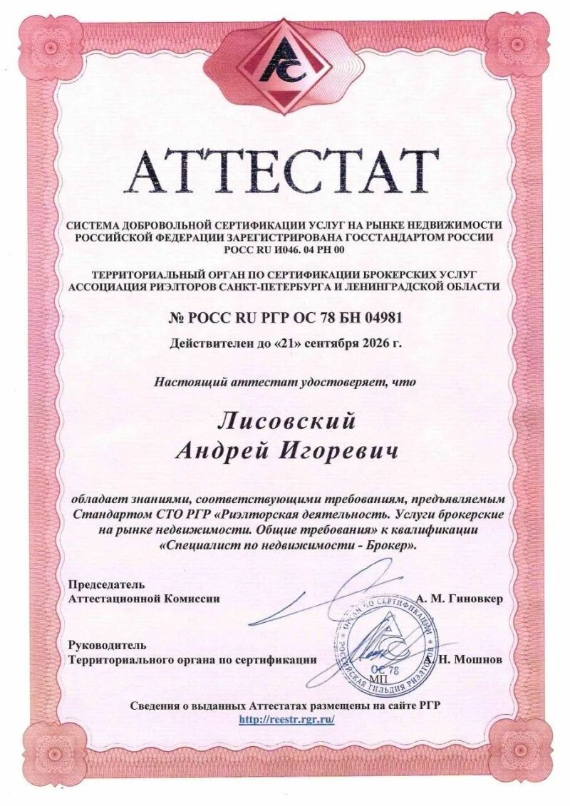 - Аттестат Российской гильдии риелторов, срок действия — до 21 сентября 2026 года, 2023 г.