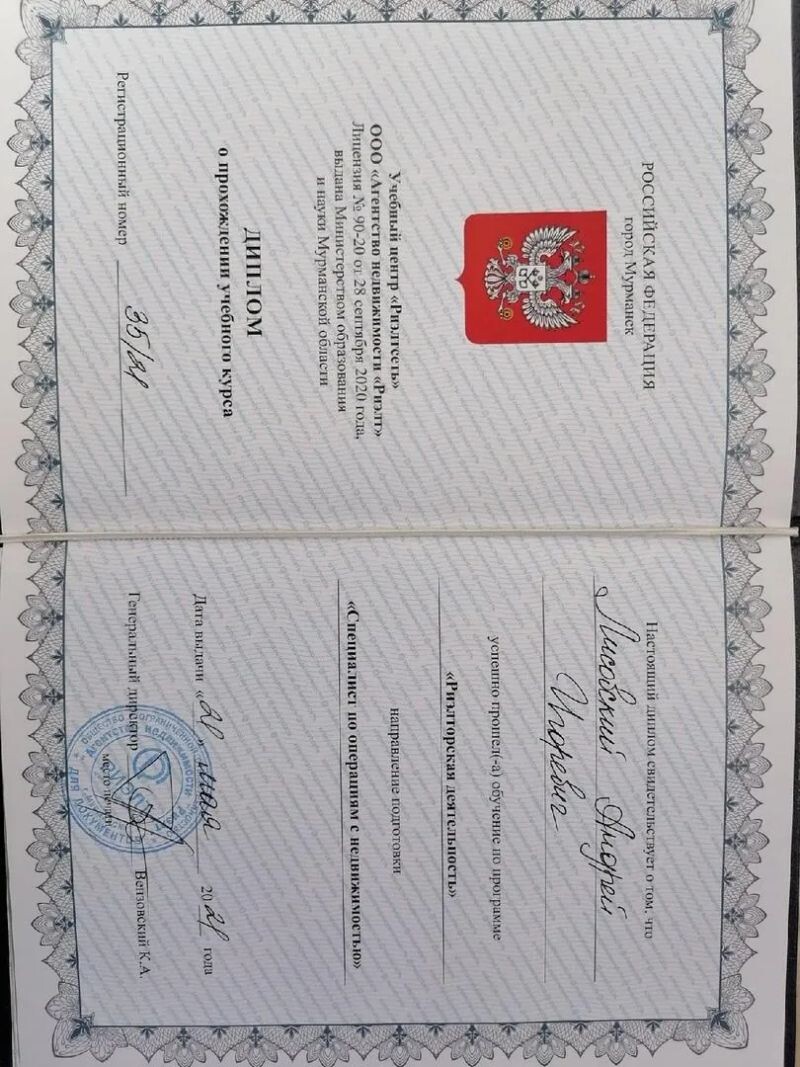 - Мурманская региональная гильдия риелторов, специалист по операциям с недвижимостью, 2017–2022 гг.