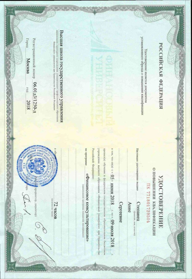 - Финансовый университет при Правительстве Российской Федерации, финансовое консультирование, 2018 г.