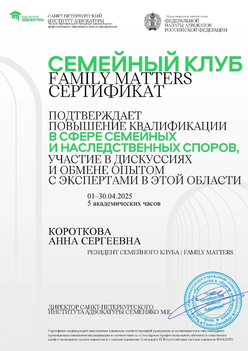 - Национальный исследовательский университет «Высшая школа экономики», программа «Медиация и психология личности в разрешении конфликтов: правовой и психологический аспект» (с 2025 г.).