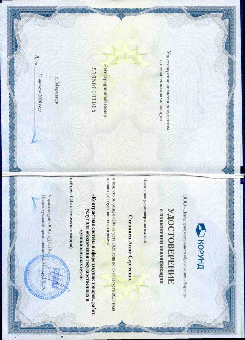 - Центр дополнительного образования «Корунд», повышение квалификации по программе «Контрактная система в сфере закупок товаров, работ, услуг для обеспечения государственных и муниципальных нужд», 2020 г.