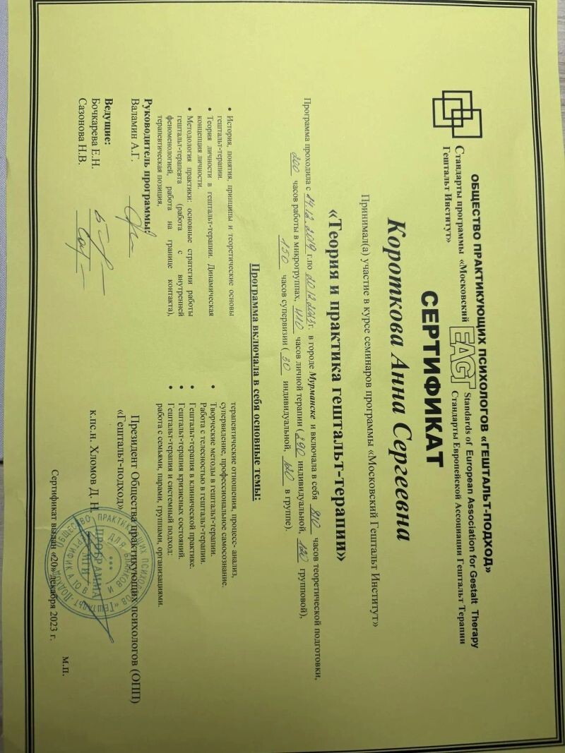 - Московский гештальт институт, Гештальт, 810 часов, 2019–2023 гг.