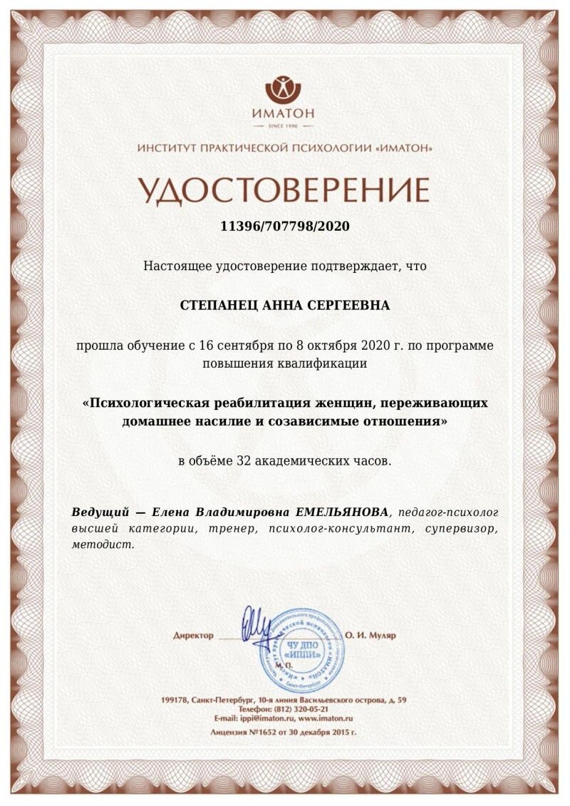 - Институт практической психологии "Иматон" повышение квалификации "Психологическая реабилитация женщин, переживающих домашнее насилие и созависимые отношения", 2020 г.