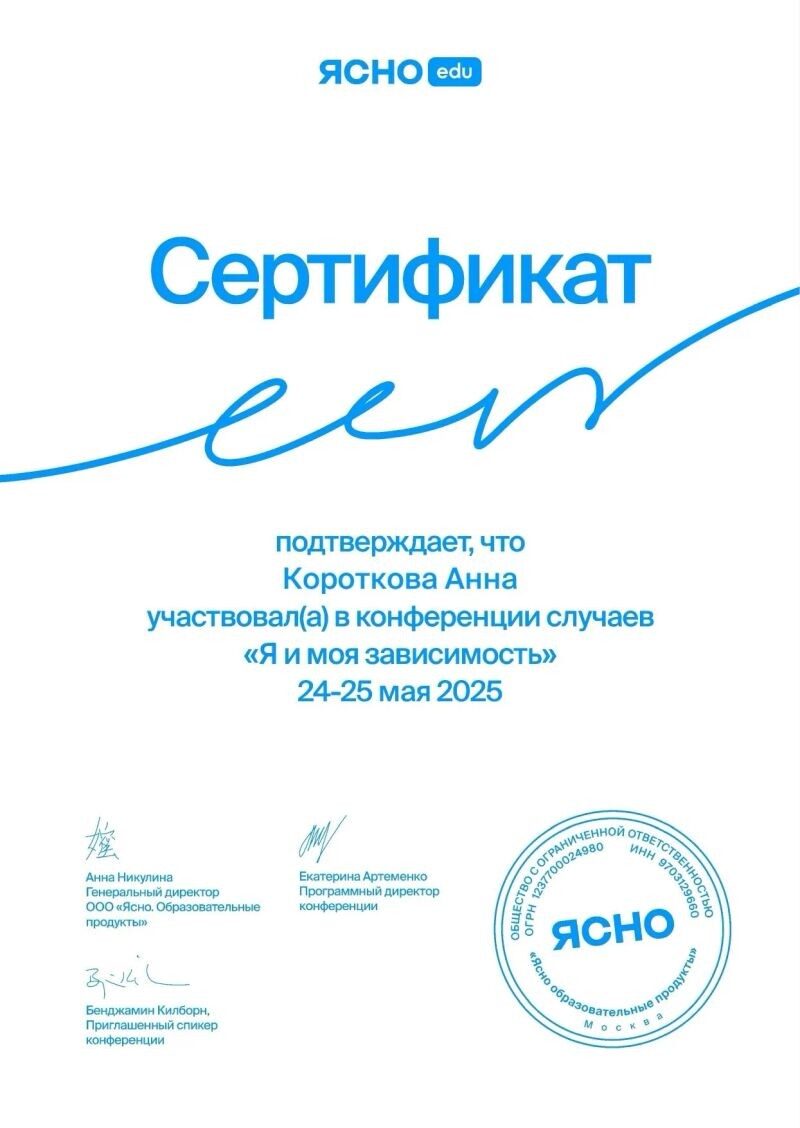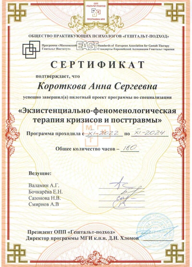 - Московский гештальт институт "Экзистенциально-феноменологическая терапия кризисов и посттравмы", 2022–2024 гг.