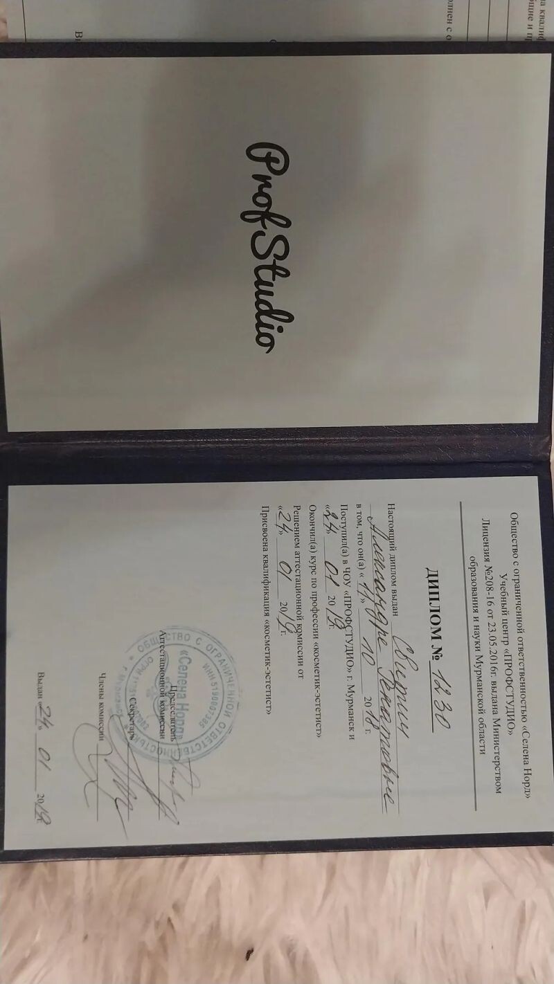 - Общество с ограниченной ответственностью «Селена Норд», Учебный центр «ПРОФСТУДИО», курс по профессии «косметик-эстетист», 2018–2019 гг.