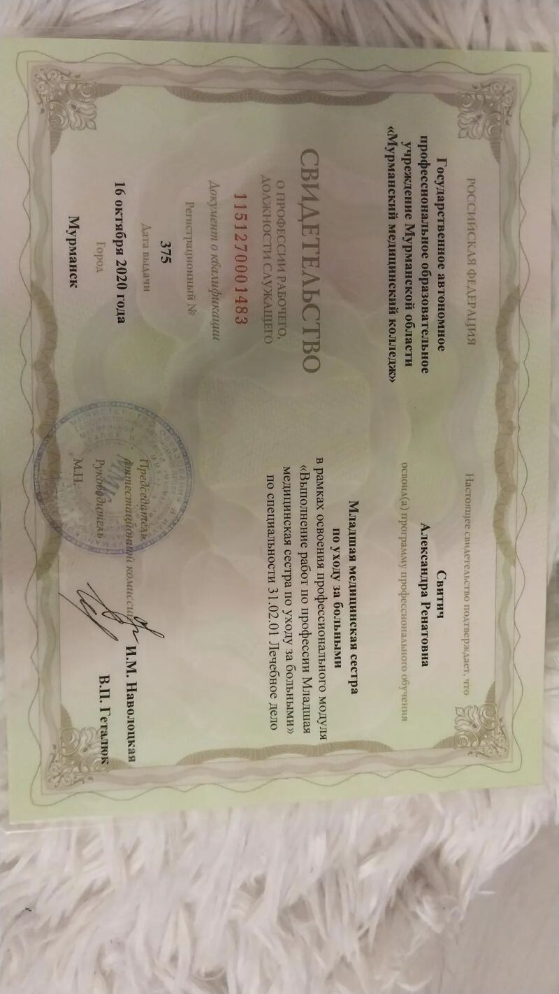 - Государственное автономное профессиональное образовательное учреждение Мурманской области «Мурманский медицинский колледж», программа «Младшая медицинская сестра по уходу за больными», специальность «лечебное дело», 2017–2020 гг.