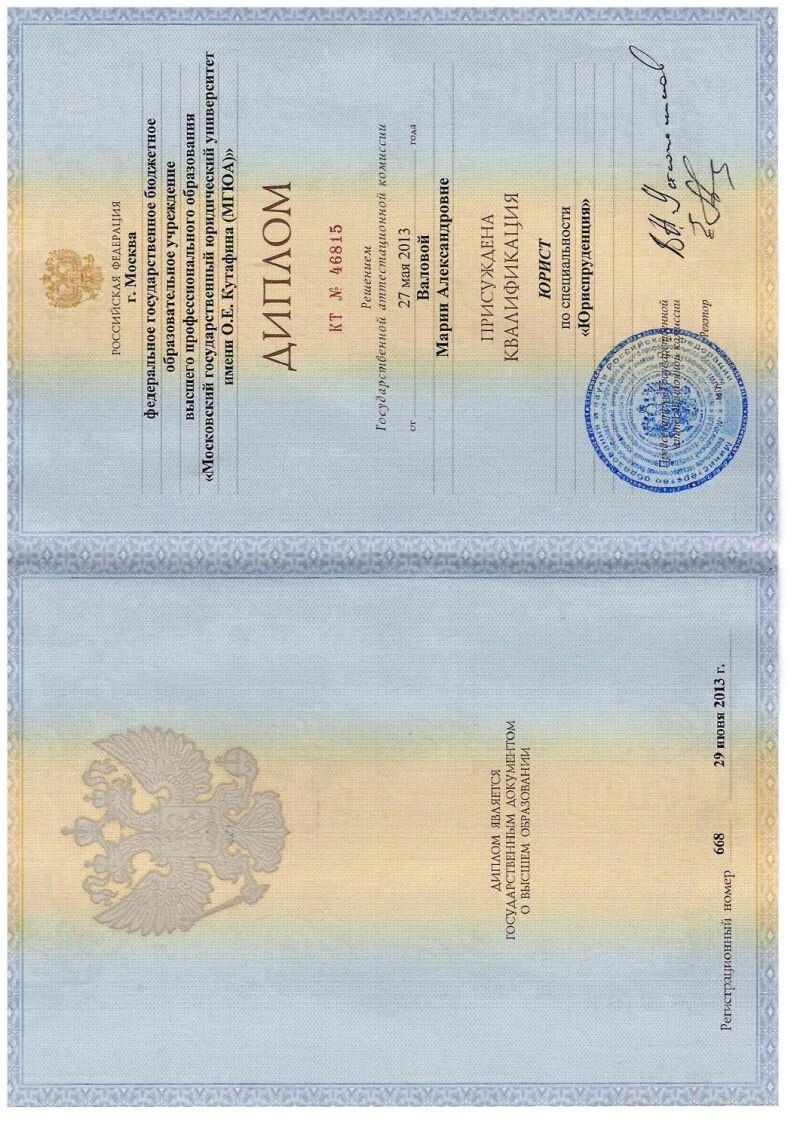 - МГЮА им. О.Е. Кутафина, юриспруденция, 2008–2013 гг.