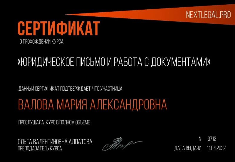 - Школа права Мадины Сюняевой, повышение квалификации, юрист по потребительским спорам, 2022 г.
