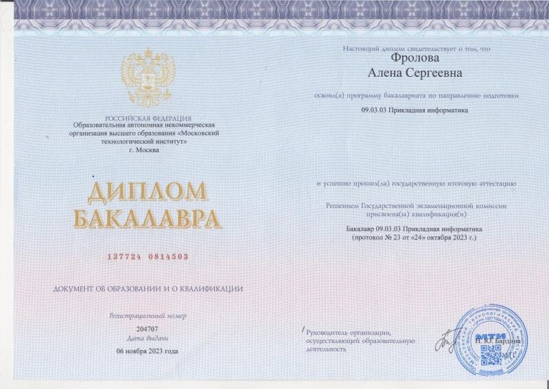 - Образовательная автономная некоммерческая организация высшего образования "Московский технологический институт", Прикладная информатика, 2019–2023 гг.