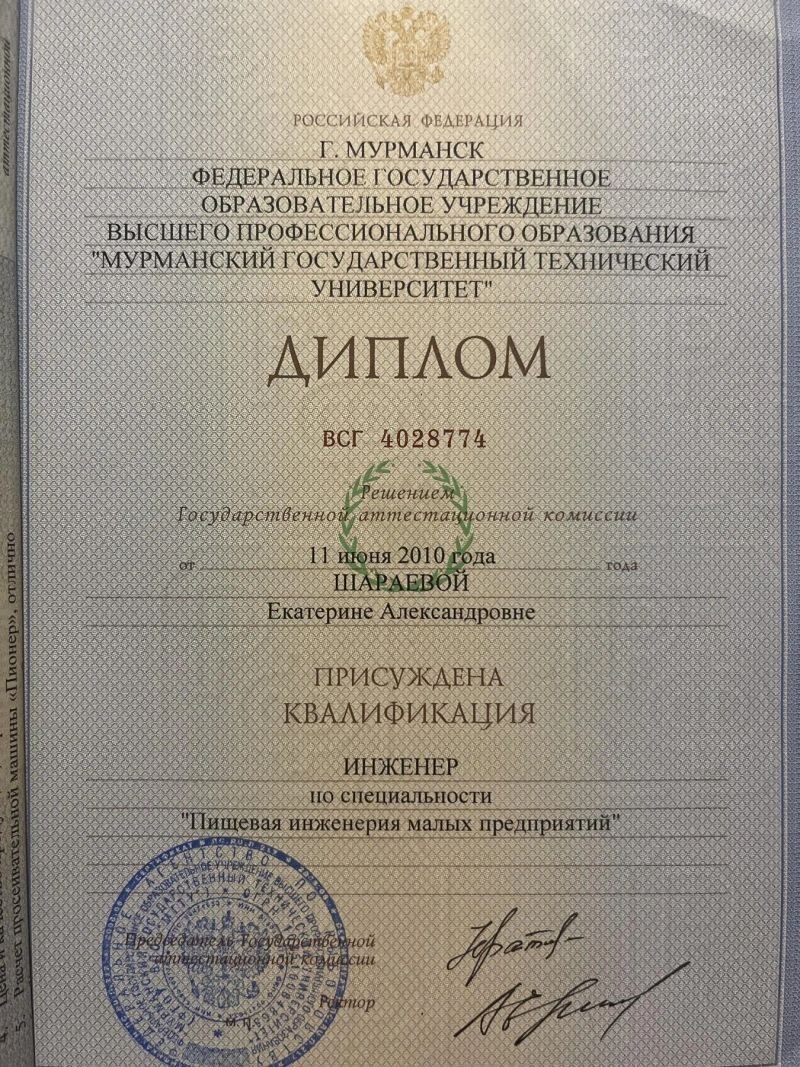 - Мурманский государственный технический университет, инженер, 2005–2010 гг.