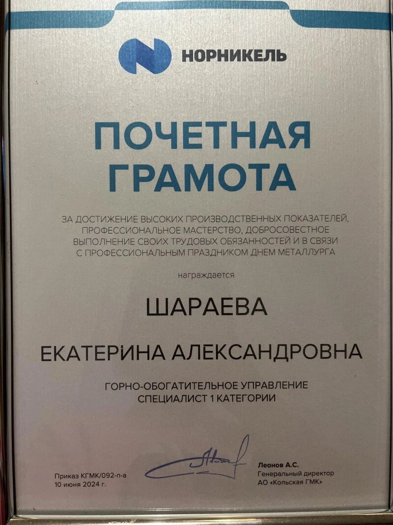 - Почётная грамота Норникель за достижение высоких производственных показателей, профессиональное мастерство, добросовестное выполнение своих трудовых обязанностей, 2024 г.