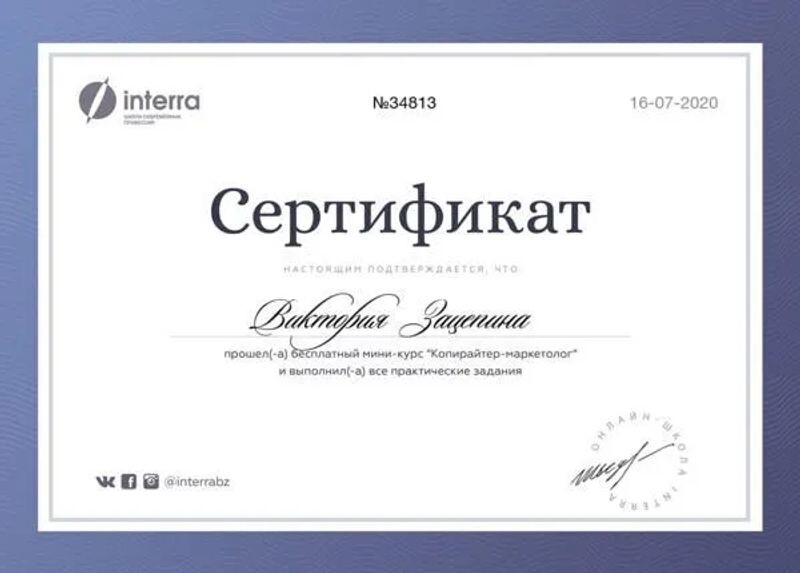 - Interra школа современных профессий, копирайтер-маркетолог, 2020 г.