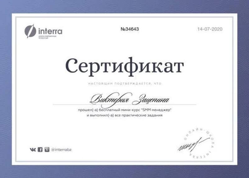 - Interra школа современных профессий, SMM-менеджер, 2020 г.