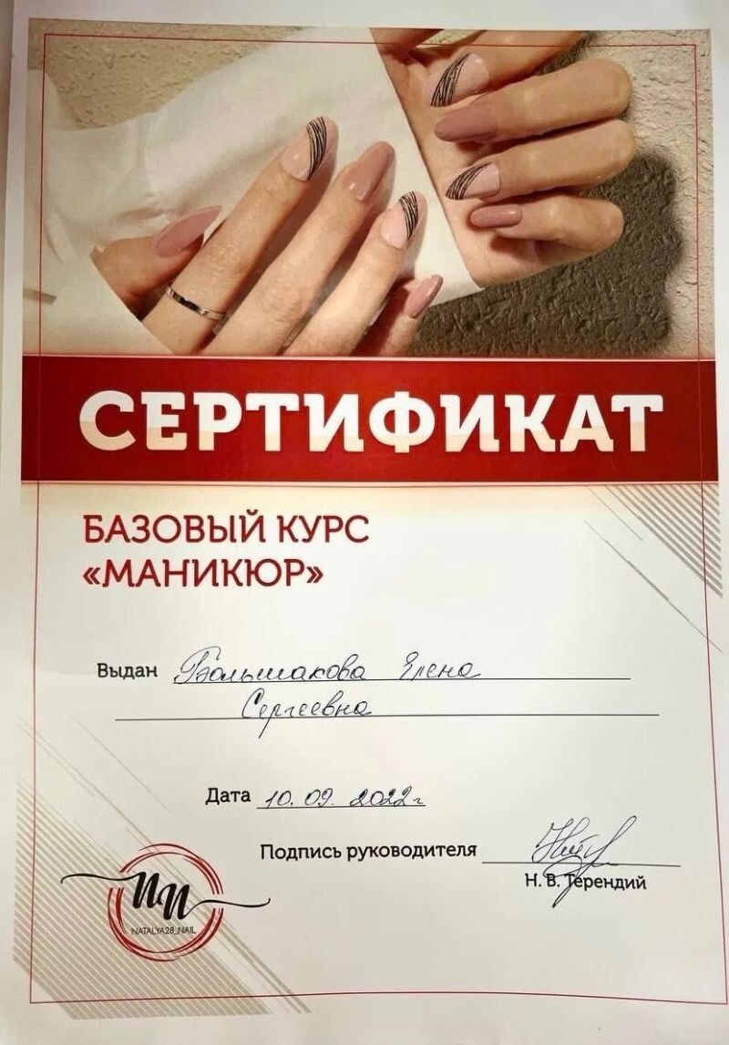 - Сертификат, базовый курс «Маникюр» (с 2022 г.).
