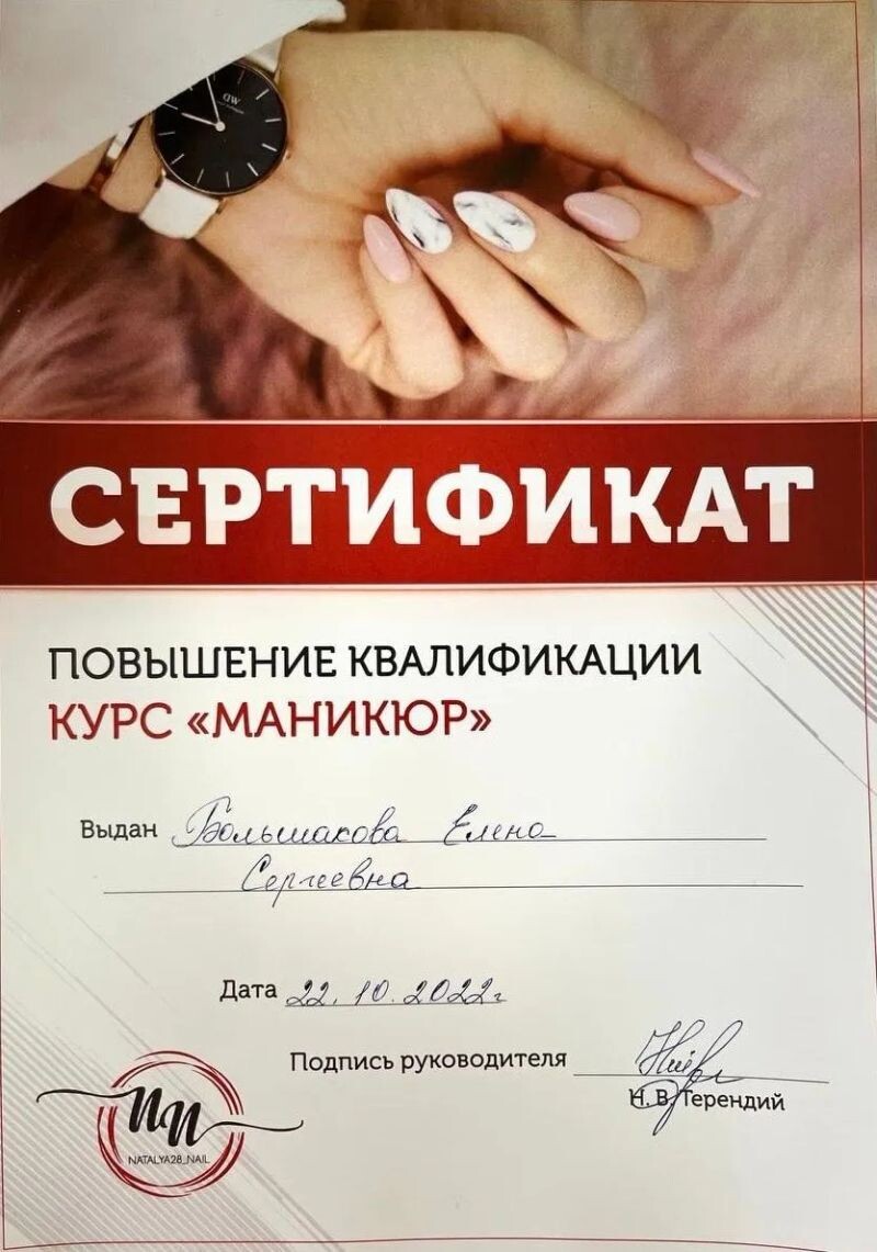 - Сертификат о повышении квалификации, курс «Маникюр» (с 2022 г.).