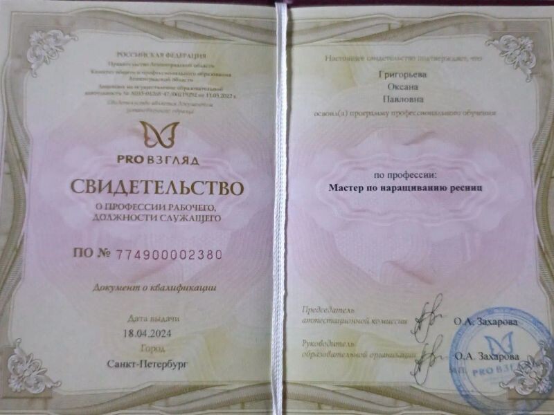 - МЕЖДУНАРОДНАЯ БИЗНЕС-ШКОЛА "PRO Взгляд" (г. Санкт -Петербург). Мастер по наращиванию ресниц (с 2024 г.).