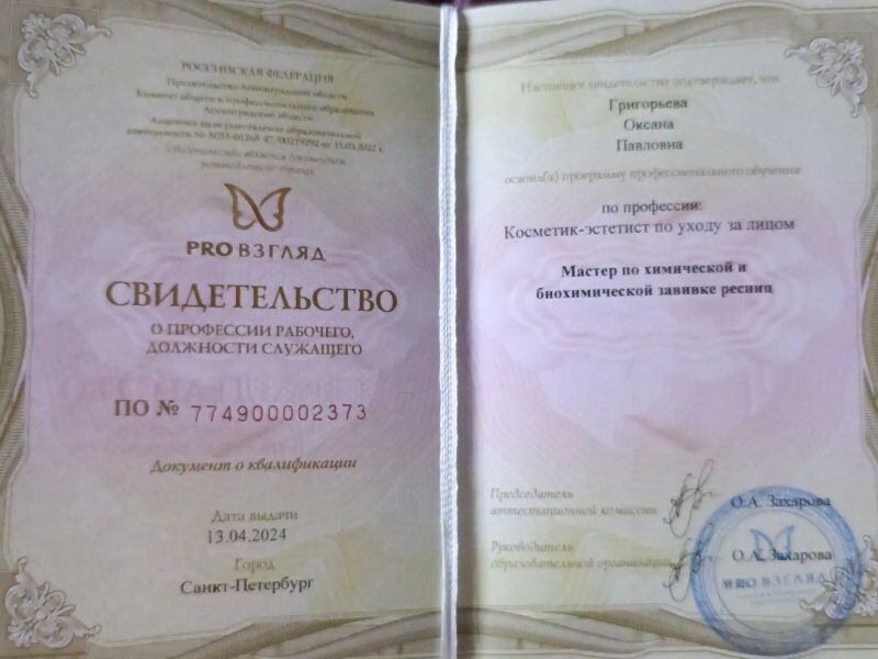 - МЕЖДУНАРОДНАЯ БИЗНЕС-ШКОЛА "PRO Взгляд" (г. Санкт -Петербург). Мастер по химической и биохимической завивке ресниц, 2024 г.
