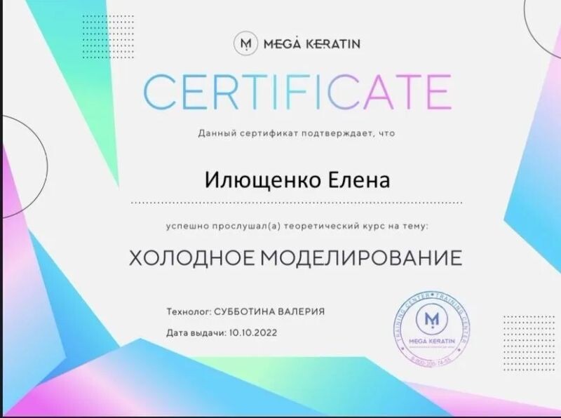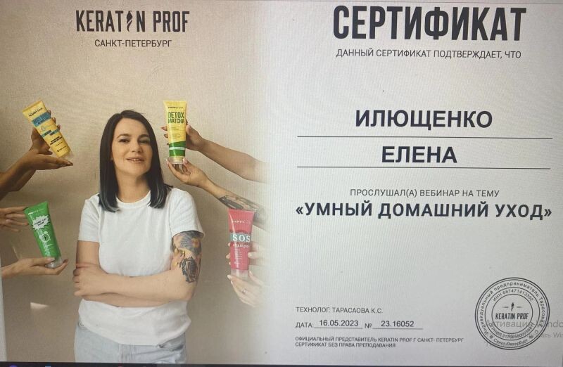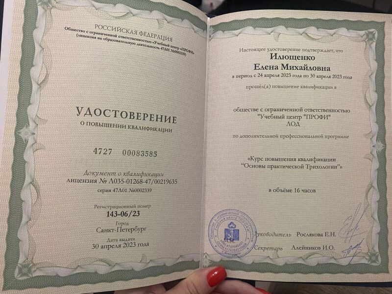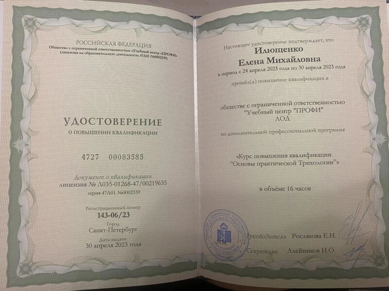 - Учебный центр «Профи», курс повышения квалификации «Основы практической трихологии», 2023 г.