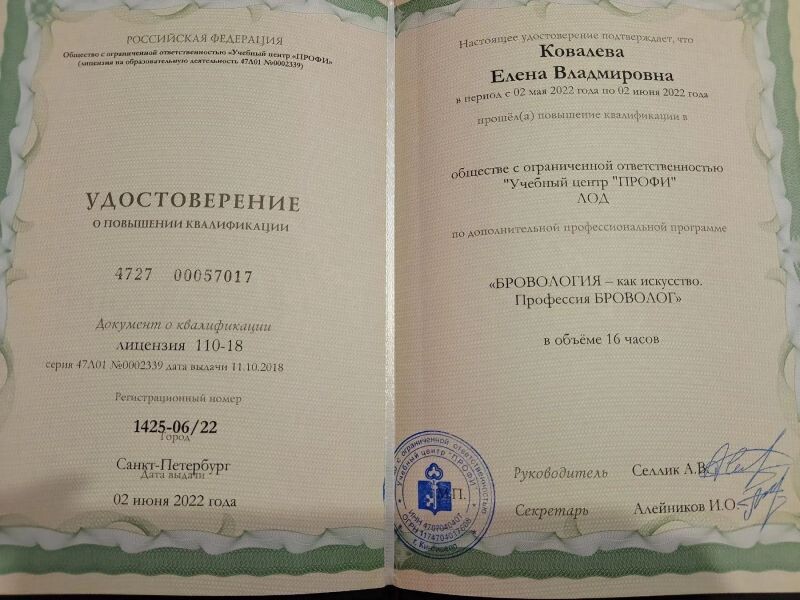- Учебный центр «Профи», программа «Бровология — как искусство. Профессия броволог», 2022 г.