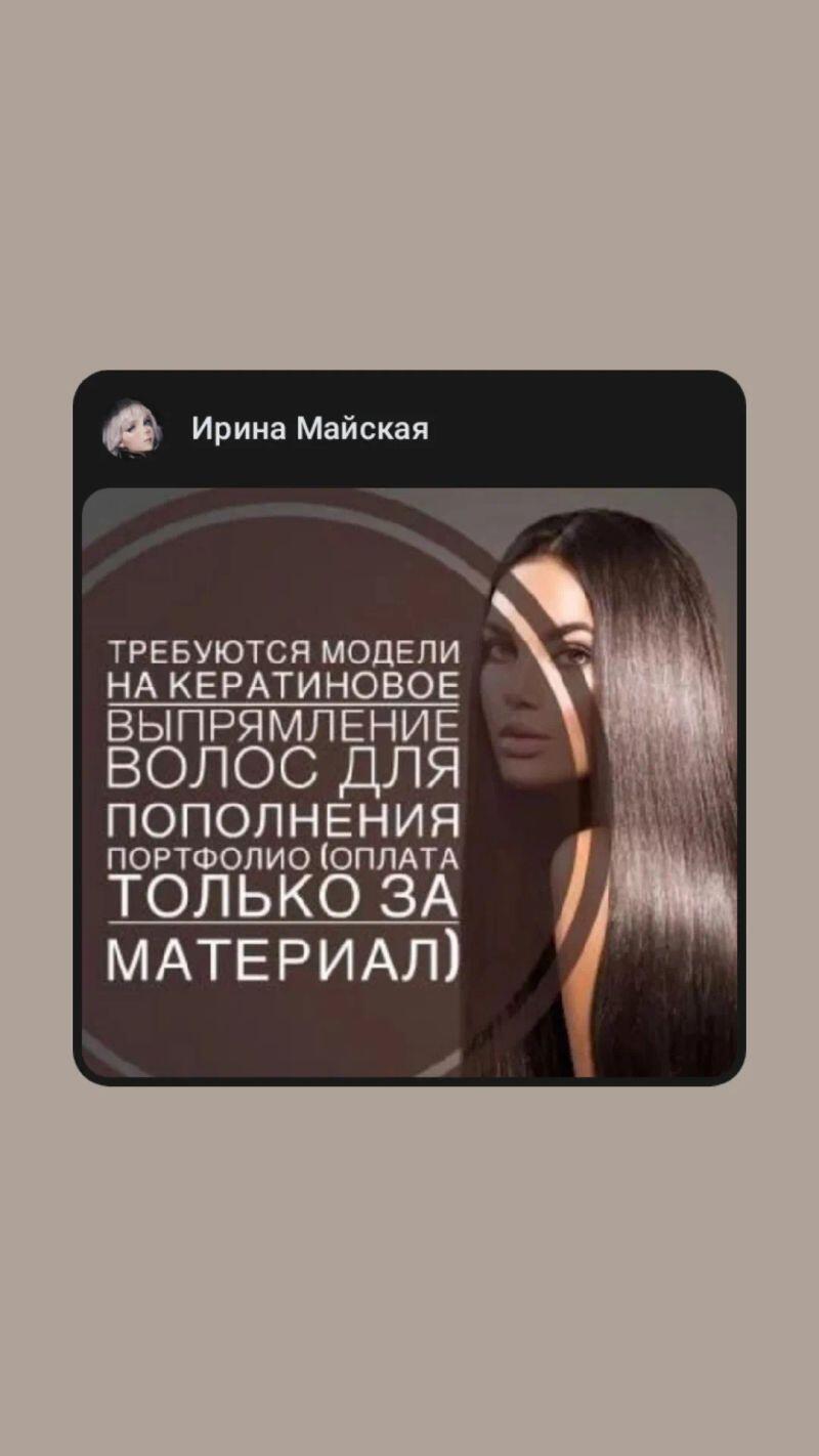 - Кератиновое восстановление волос 1500 ₽ за усл.Требуются модели