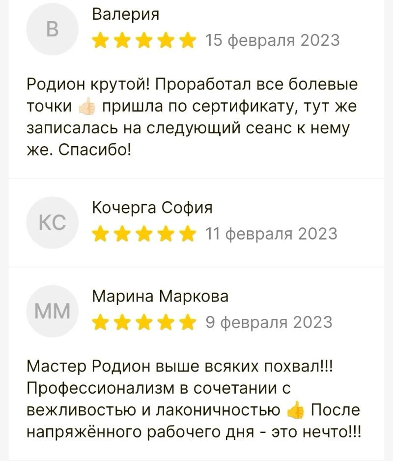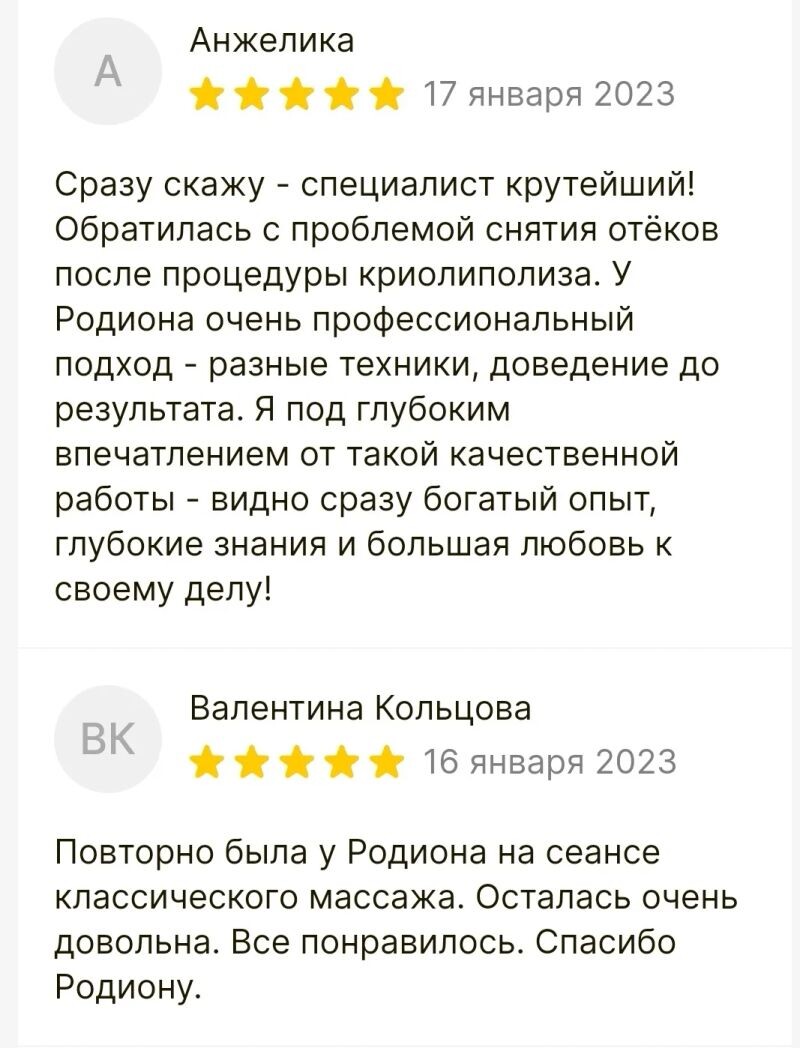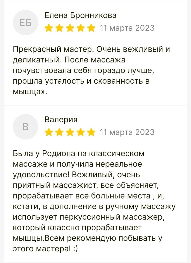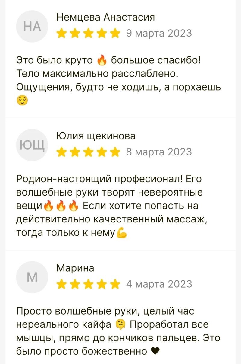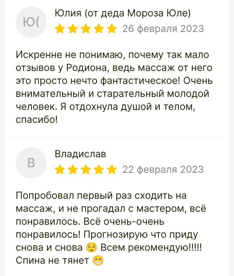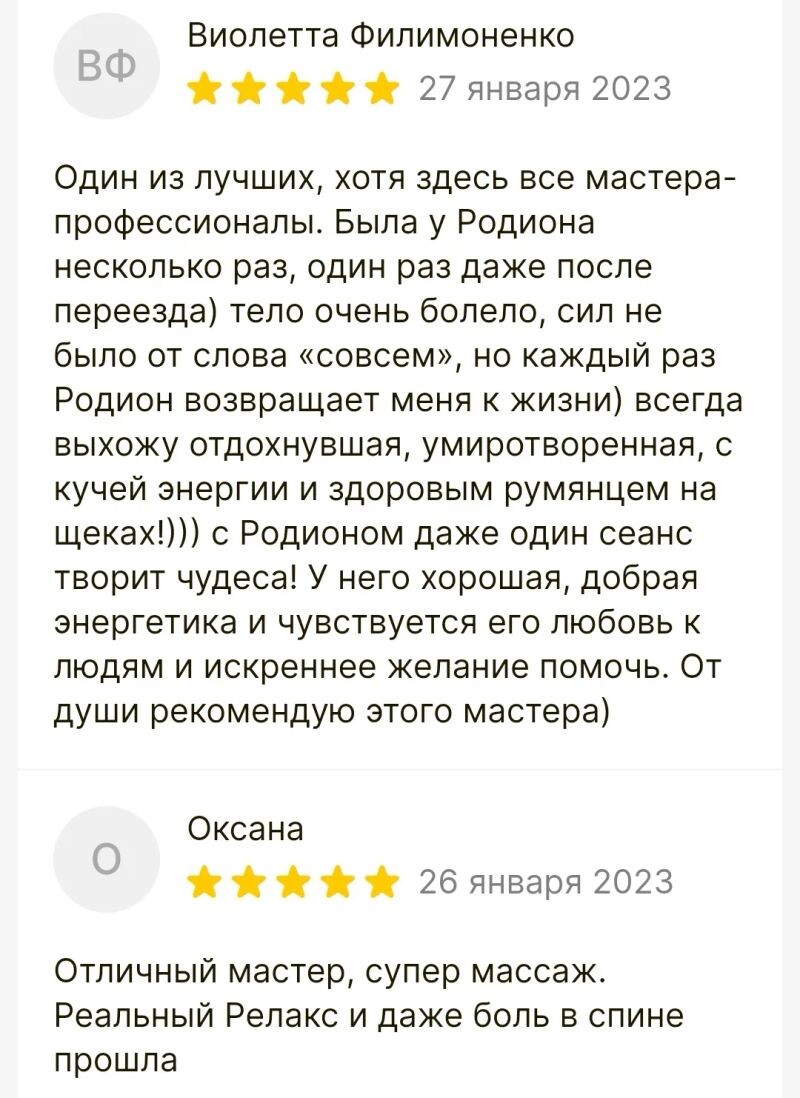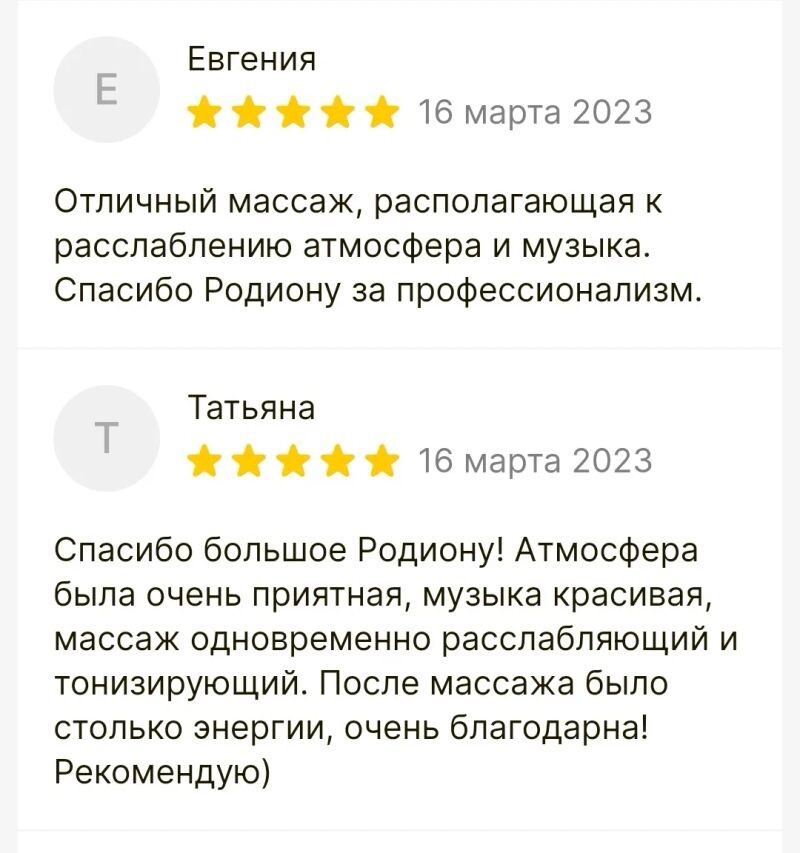 Пока нет ни одного отзыва об этом массажисте. Ваш отзыв может стать первым!