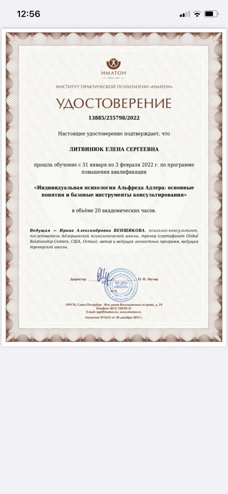 - ИМАТОН, удостоверение о повышении квалификации по программе «Индивидуальная психология Альфреда Адлера: основные понятия и базовые инструменты консультирования», 20 часов, 2022 г.