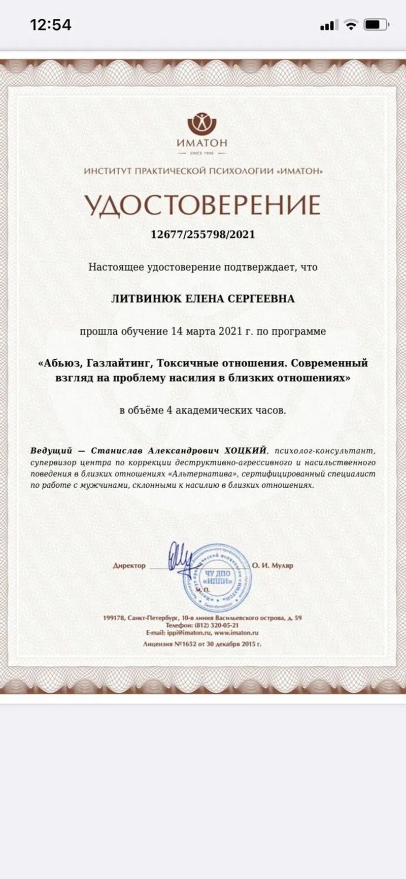 - ИМАТОН, обучение по программе «Абьюз, газлайтинг, токсичные отношения, современный взгляд на проблему насилия в близких отношениях», 4 часа, 2021 г.