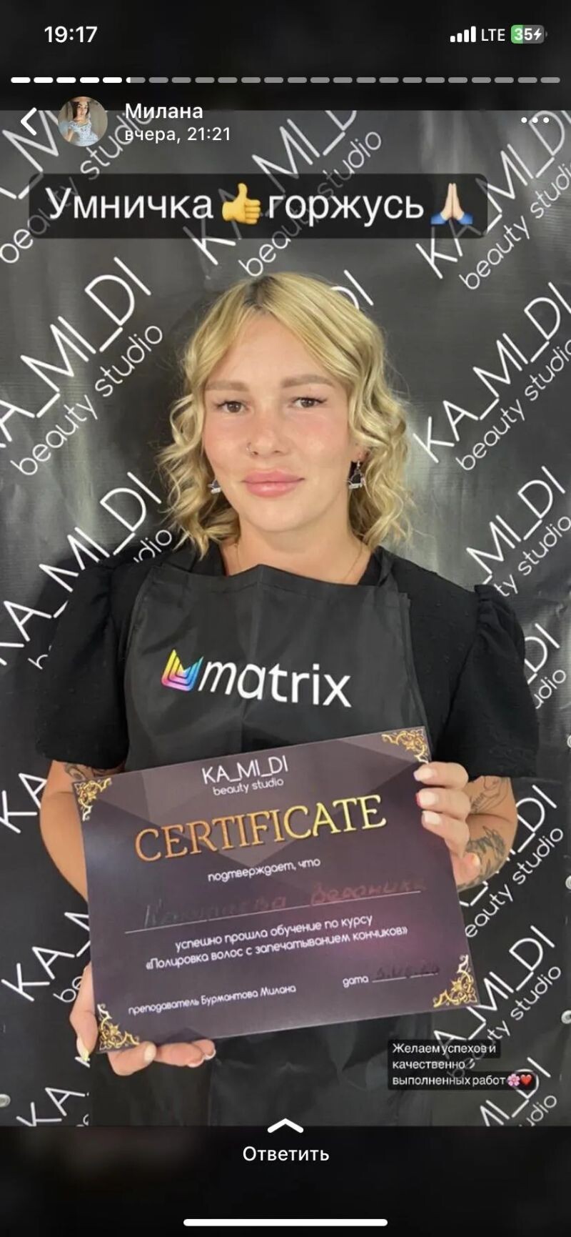 - Camidi, курс «Полировка волос с запечатыванием кончиков», 2023 г.