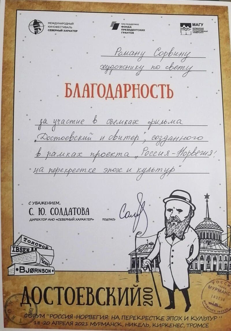 - Благодарность за съёмки короткометражки «Достоевский и свитер», 2021 г.