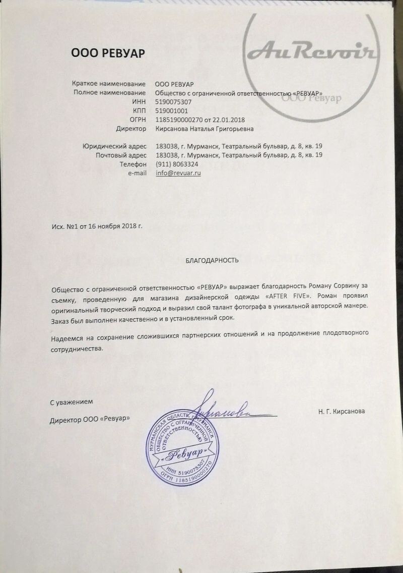 - Ревуар, благодарственное письмо за съёмку для магазина одежды, 2018 г.