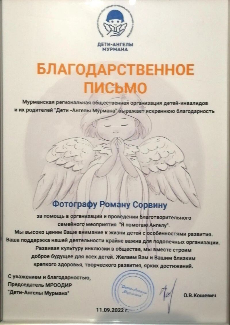 - Дети-ангелы Мурмана, благодарность за помощь в организации и проведении благотворительного семейного мероприятия «Я помогаю ангелу», 2022 г.