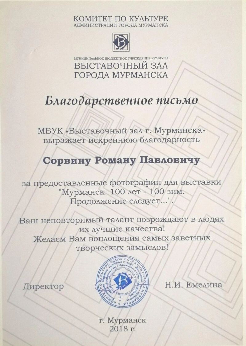 - Комитет по культуре города Мурманска, благодарность за участие в фотовыставке, 2018 г.