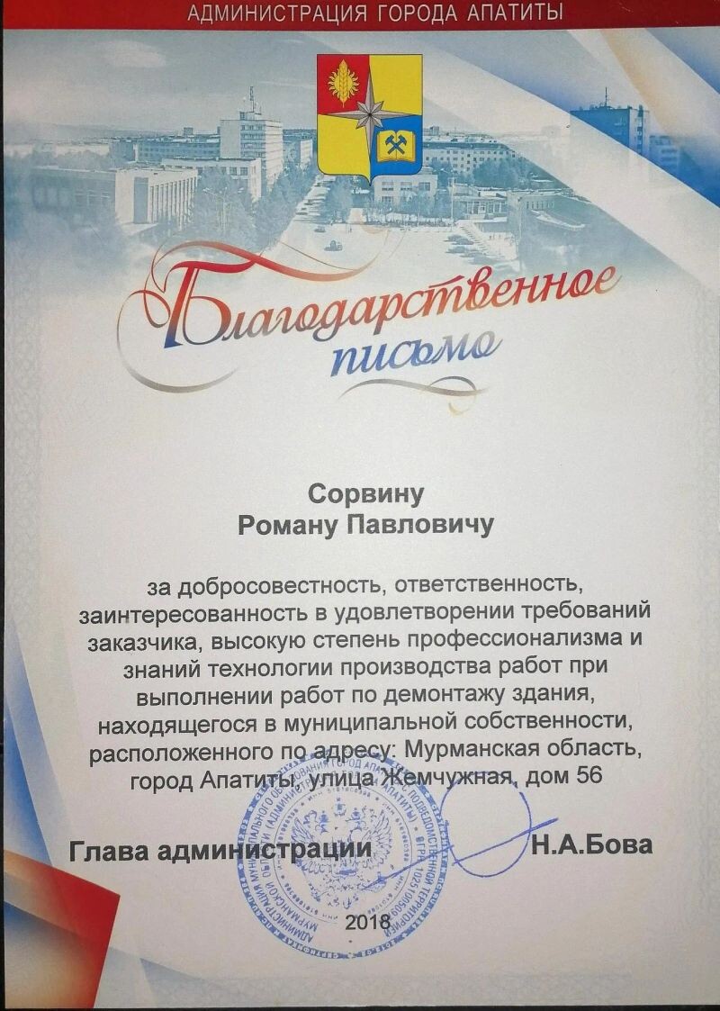 - Благодарность за профессионализм при демонтаже здания в Мурманской области, 2018 г.
