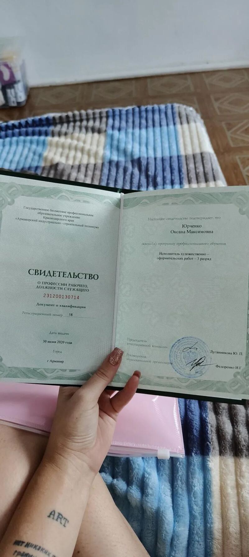 - Исполнитель художественно оформительных работ, 2016–2019 гг.