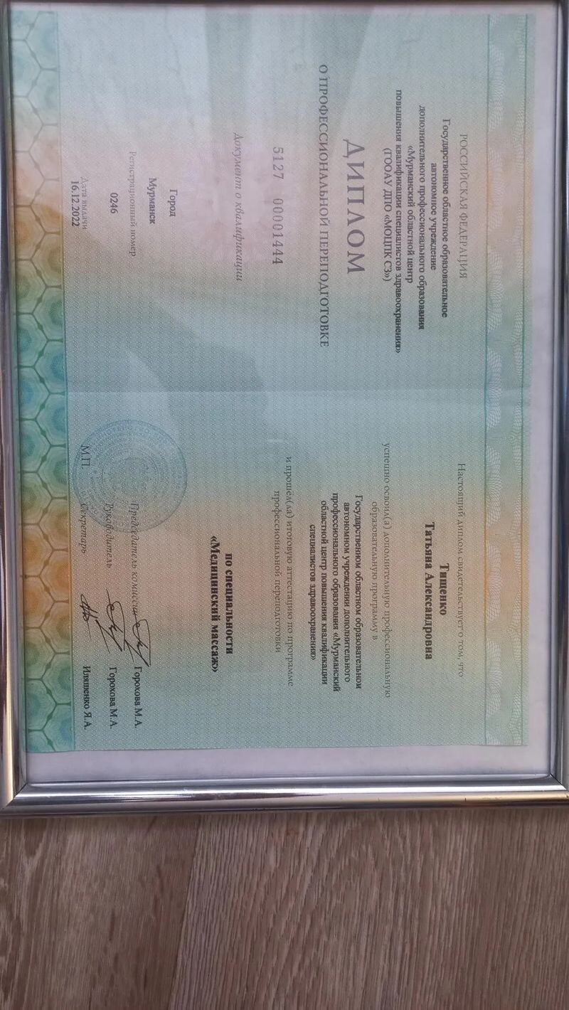 - ГООАУ ДПО «МОЦПК СЗ», специальность «медицинский массаж», 2022 г.