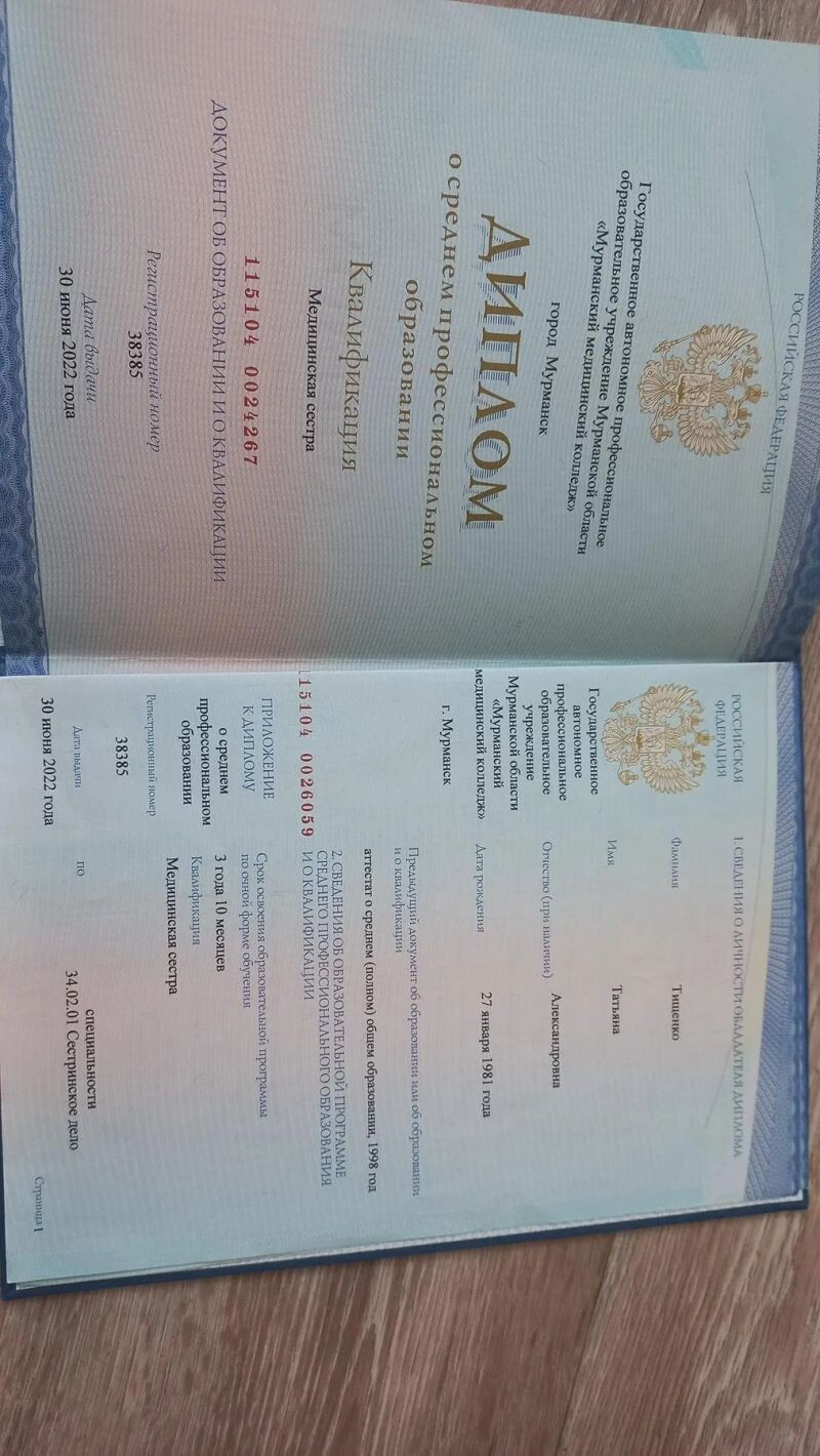 - ГАПОУ Мурманской области «Мурманский медицинский колледж», квалификация «медицинская сестра», 2018–2022 гг.