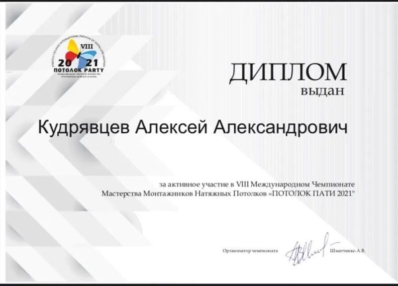 - Участие в VIII Международном Чемпионате Мастерства Монтажников Натяжных Потолков «ПОТОЛОК ПАТИ 2021».