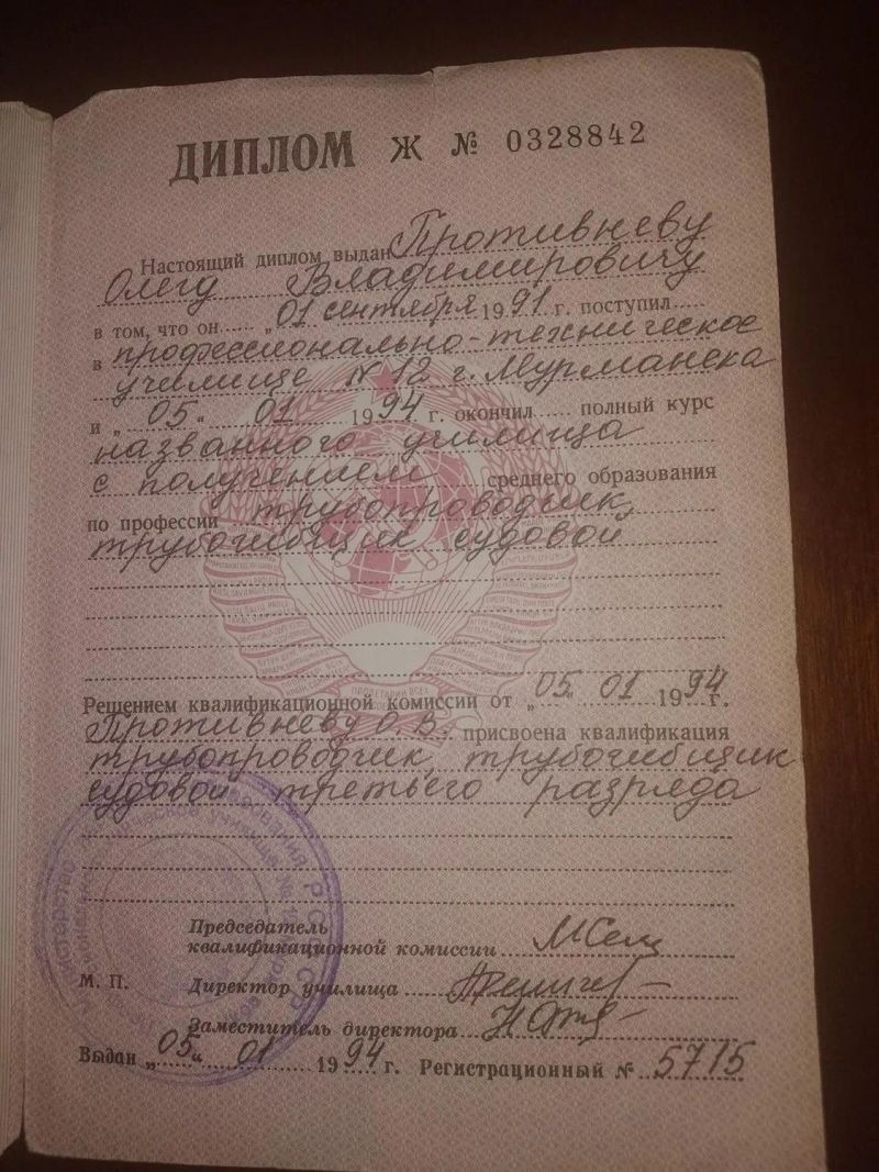- Профессионально-техническое училище №12 г. Мурманска, трубопроводчик, 1991–1994 гг.