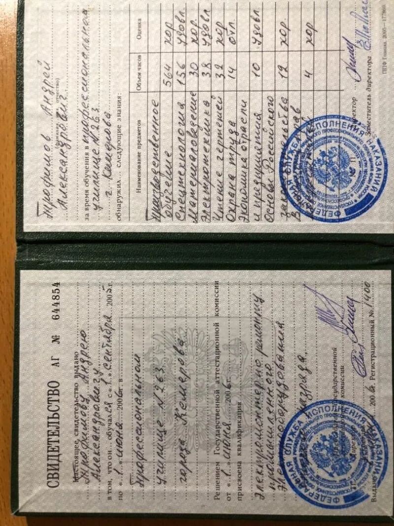 - Электромонтёр по ремонту промышленного электрооборудованию, Профессиональное училище №263, 2005–2006 гг.