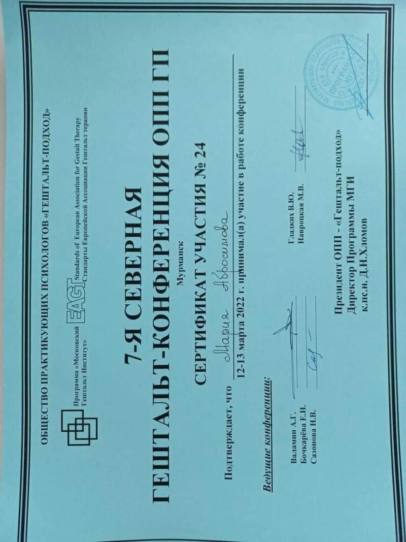 - ОПП «Гештальт-подход», программа «Московский гештальт институт», участие в 7-й Северной гештальт-конференции ОПП «ГП», 2022 г.