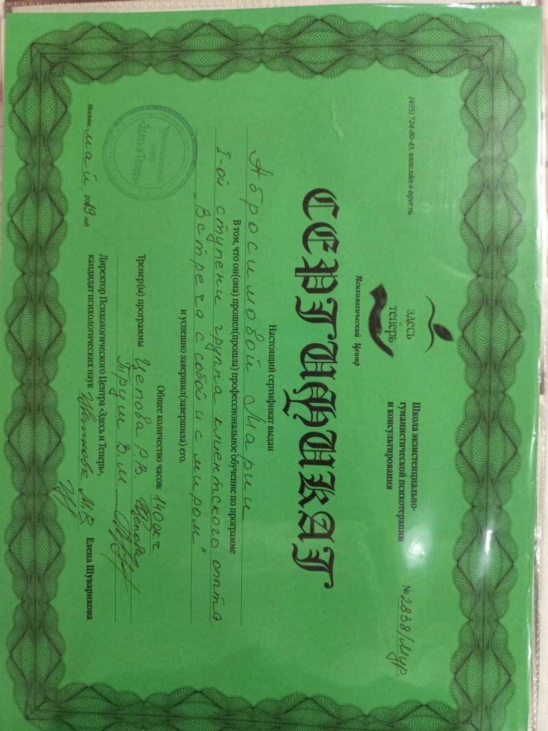 - Школа экзистенциально-гуманистической психотерапии и консультирования психологического центра «Здесь и Теперь», программа 1 ступени клиентского опыта «Встреча с собой и миром» (140 ак. часа), 2018–2019 гг.