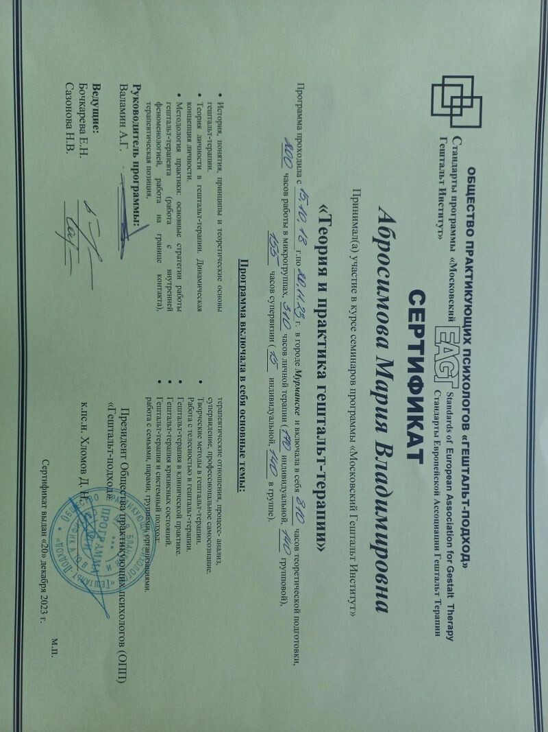 - ОПП «Гештальт-подход», программа «Московский гештальт институт», курс семинаров «Теория и практика гештальт-терапии», 2018–2023 гг.