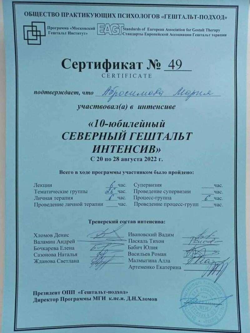 - ОПП «Гештальт-подход», программа «Московский гештальт институт», участие в 10-м Юбилейном Северном гештальт-интенсиве, 2022 г.