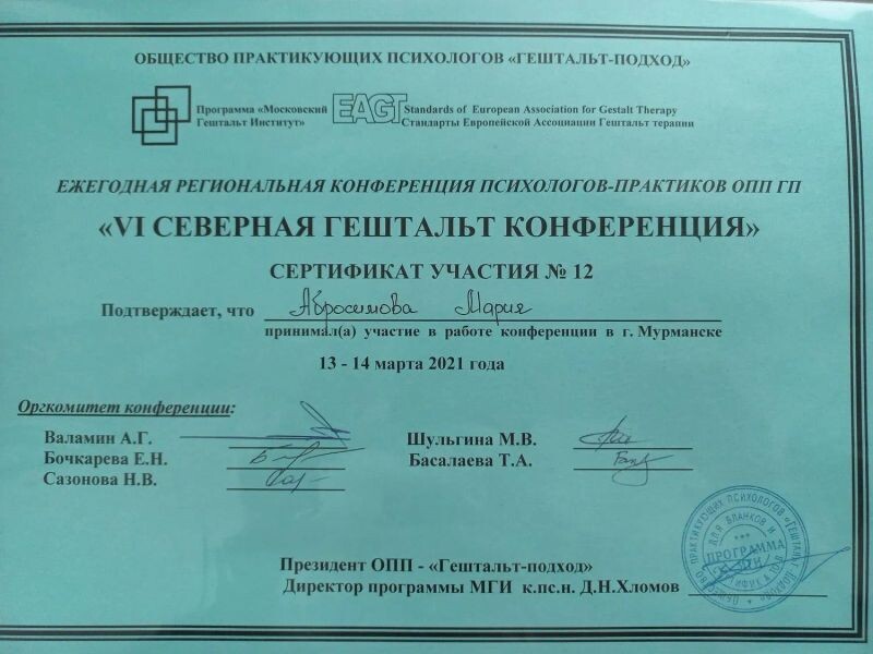 - Общество практикующих психологов «Гештальт-подход», сертификат участника ежегодной региональной конференции психологов-практиков «VI Северная Гештальт конференция», 2021 г.